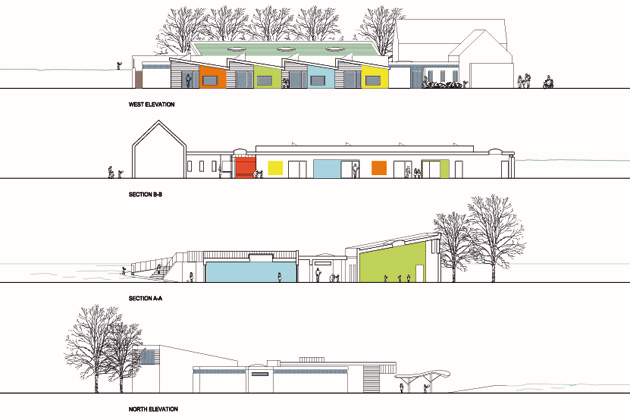 Our design concept called for a single storey building to be cut into the existing terrain, offering a sheltered and secure environment and giving classrooms direct access to outside areas, including the grounds and gardens.