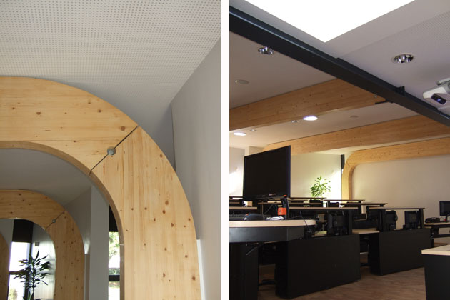 The dominant features inside the space are 5 structural curved glulam beams. The columns are left exposed and fitted to a large steel beam. This creates an interesting contrast between the steel and wood against the more refined interior finishes.