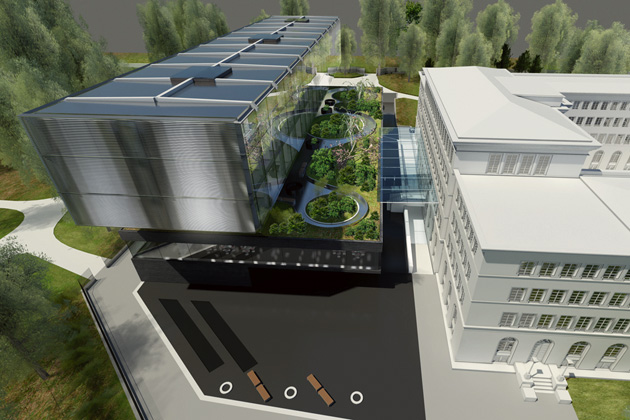 The proposal comprises of two simple forms. A solid lower block creates a raised garden. The roof garden is designed as a raised extension to the existing park. Above it hovers the second transparent block. The two blocks are linked by a double height winter garden that overlooks the historic park, Parc Barton.