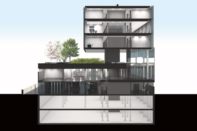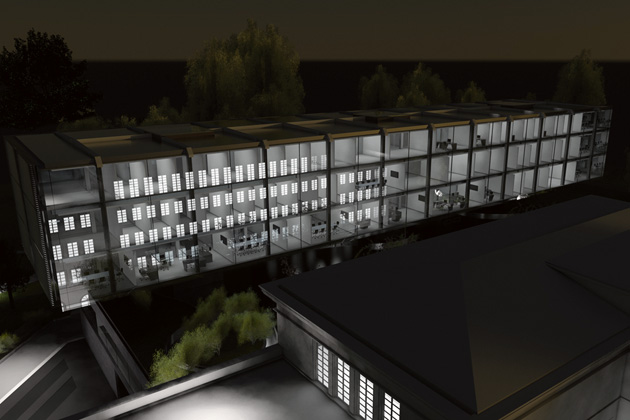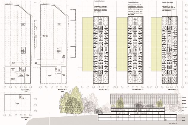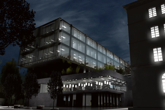 The office block floats over the raised landscape and creates a comfortable and flexible working environment, surrounded by tree canopies, and a garden. It appears like a glass pavilion amidst a landscaped horizon. The lower block is clad in a light transmitting concrete. The first floor is like a traditional Piano Nobile and is linked to the existing building via a glazed bridge. It houses the collective facilities of Restaurant and Library. These are linked to the double-height winter garden that overlooks the parkland.